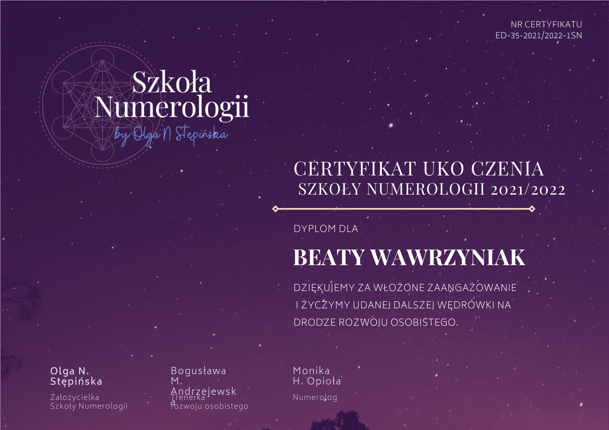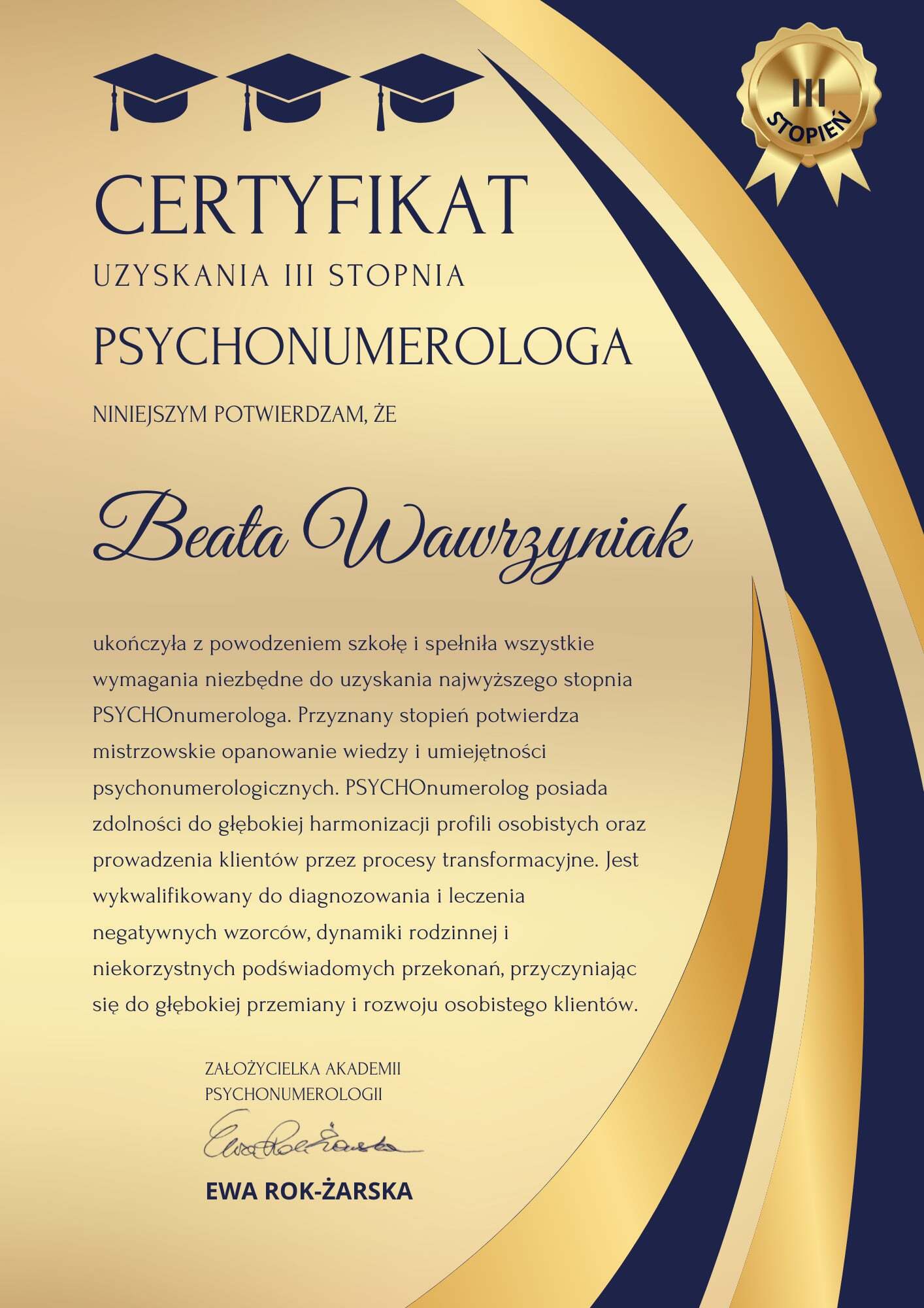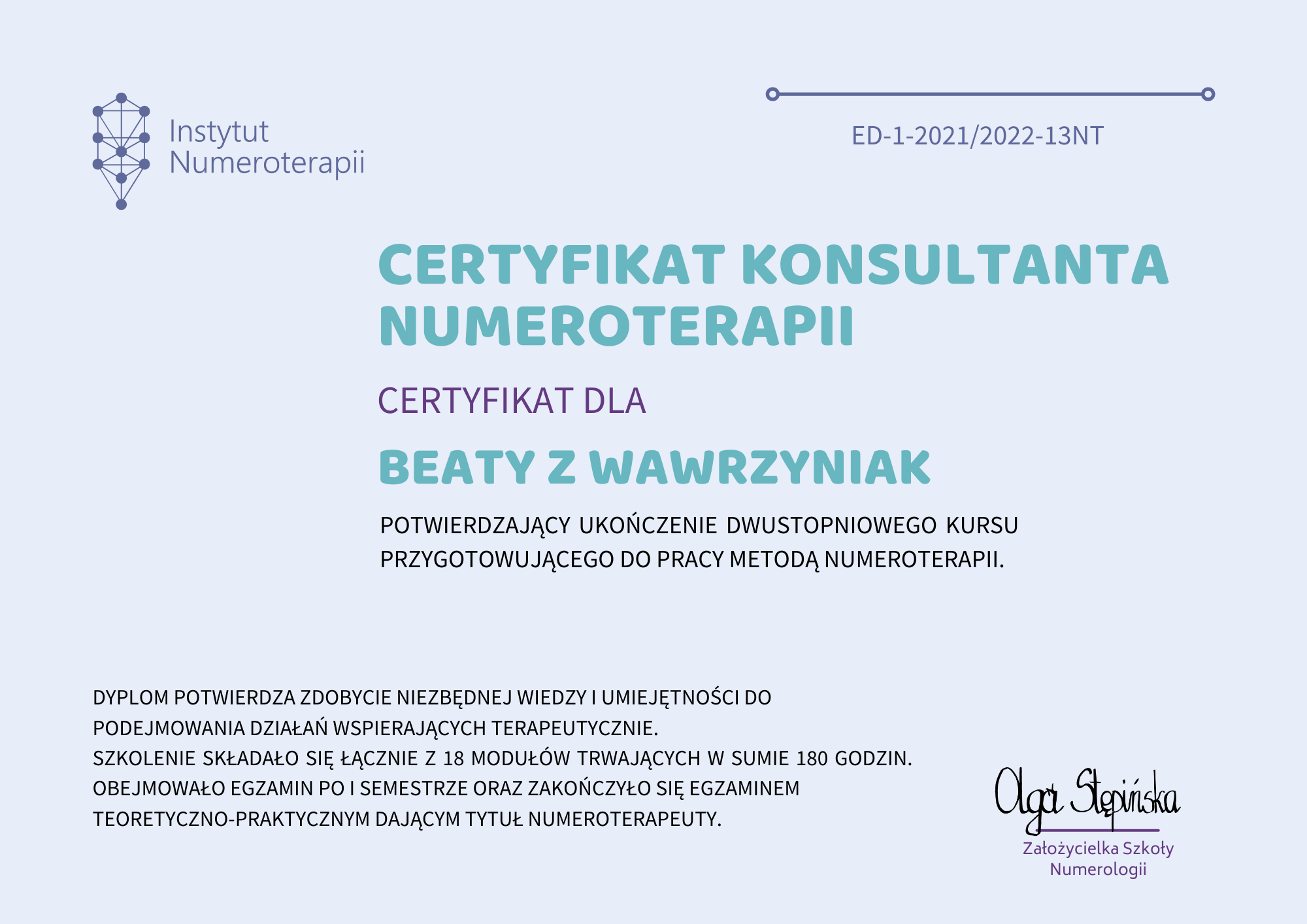 Numerologia to moja pasja, która stała się moją pracą i moim zawodem. Uwielbiam pomagać innym i obserwować jak moi Klienci stają się coraz bardziej zadowoleni, uśmiechnięci i szczęśliwi. Jestem bardzo cierpliwą i uważną słuchaczką, co daje moim Klientom duży komfort w czasie sesji. Sporządzane przeze mnie portrety numerologiczne pomogą Ci lepiej poznać siebie, swoje talenty, a także pięty achillesowe i, co za tym idzie, łatwiej podejmować decyzje i realizować swoje cele.