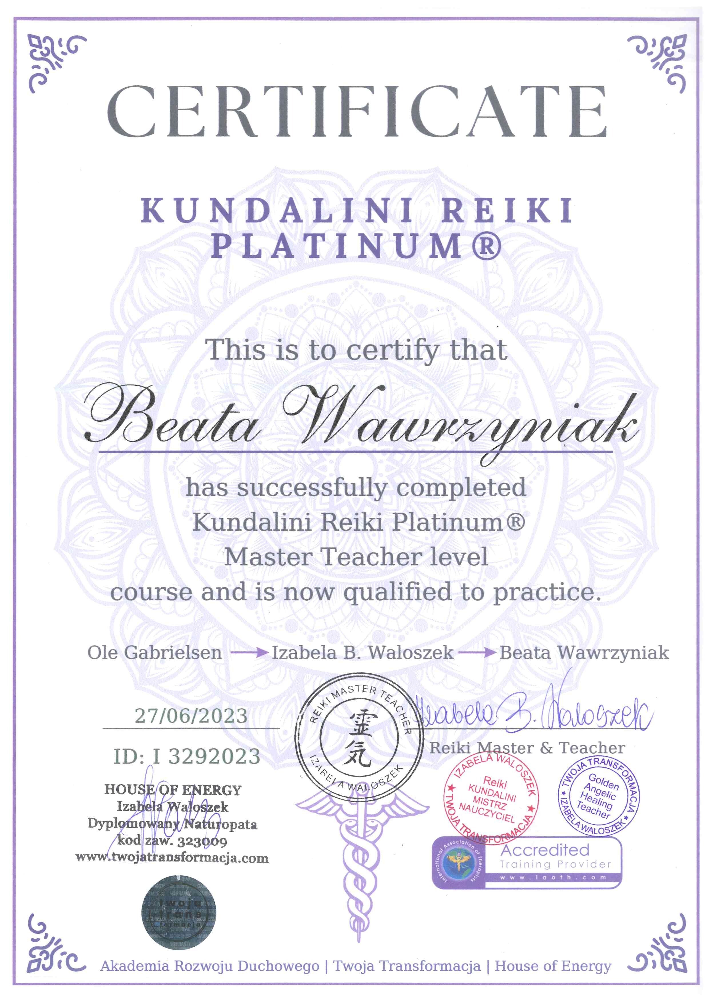 Jestem także praktykującą Mistrzynią Reiki Usui oraz Mistrzynią Kundalini Reiki Platinum. Energia Reiki jest subtelną, uniwersalną siłą, wspomagającą równowagę fizyczną, emocjonalną i duchową. Przekazuję energię Reiki głównie na odległość i możesz skorzystać z takiego zabiegu w dowolnym miejscu na świecie – tam gdzie obecnie się znajdujesz – w swoim domu, w pracy czy na wakacjach. Dla energii nie ma przeszkód i działa tak samo – niezależnie. czy jesteś obok mnie. czy nawet na drugim końcu świata. Energia Reiki pomaga w łagodzeniu stresu, poprawie snu, redukcji bólu oraz wzmacnianiu ogólnego samopoczucia. Reiki może być stosowana jako uzupełnienie konwencjonalnych terapii, wspomagając naturalne zdolności organizmu do samoleczenia. Jej wpływ jest indywidualny, a wielu moich Klientów doświadcza uczucia relaksu i wewnętrznej równowagi już po jednej sesji.